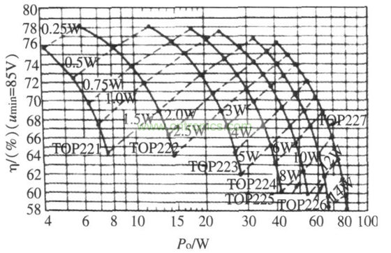 宽范围输入的交流电压为85~ 265 V, 在这种条件下,TOP221~ TOP227 系列单片开关电源的P D,η,Po 关系曲线如下,见图3、图4。