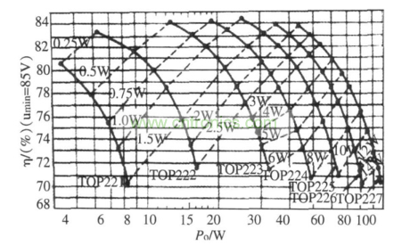 在设计开关电源时,首先就要面临如何选择合适的开关电源控制芯片。在选择芯片的时候,要既能满足要求,又不因为选型造成资源的浪费。下面就介绍利用TopswitchⅡ系列开关电源的功率损耗( PD ) 与电源效率(η),输出功率( Po ) 关系曲线,快速选择芯片的型号,从而完成宽范围输入的通用开关电源的设计。