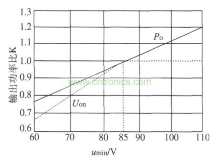 PD ,η, Po 关系曲线均对交流输入电压的最小值进行了限制,umin = 85 V.如果交流输入电压最小值不符合上述的要求,就会直接影响芯片的正确选择。此时必须从实际的交流输入电压u? min最小值对应的功率P''o 折算成umin为规定值时的等效功率Po,才能使用上面的图。功率修正的方法如下: 选择使用的特性曲线,然后根据已知的u''min值查出折算系数K;将P ''o折算成umin为规定值时的等效功率Po,表达公式P o=P''o / K;然后从图3、图4 中选用适当的关系曲线。