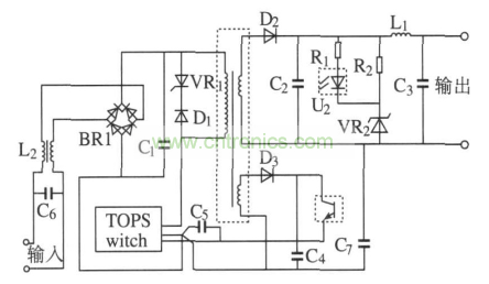 图6给出了由TOPSwitch 构成的反激式电源的原理图。其工作过程如下: 输入交流电经整流桥BR1 整流后再经电容C1 滤波,变为脉动的直流电。