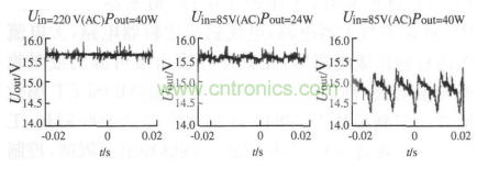 图7分别给出了输入电压220 V ( 交流),输出功率为40 W; 输入电压85 V ( 交流),输出功率为24 W和输入电压85 V( 交流),输出功率为40 W 时的输出电压波形。