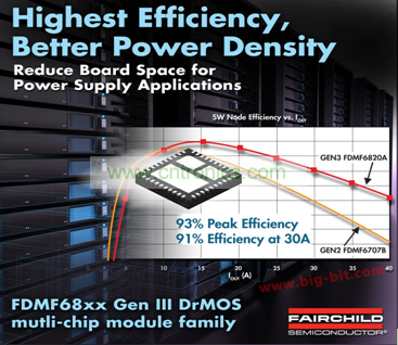 当能效标准逐渐成为电子产品新的紧箍咒,各大电源半导体厂商不得不面对电源管理技术的全新挑战。飞兆半导体 FDMF68xx Gen III DrMOS多芯片模块(MCM)系列经设计能够降低输出感量和减少输出电容器数目,与普通分立器件解决方案相比,该系列能够节省多达50%的线路板空间,并提高效率,以期满足新能源标准要求。使用飞兆半导体的高性能PowerTrench® MOSFET技术,FDMF68xx系列能够显着减少开关振铃(switch ringing),省去大多数降压转换器应用中使用的缓冲器电路。FDMF68xx系列配合针对刀片式服务器、高性能笔记本电脑、游戏主机和负载点(point-of-load)??榈男履茉幢曜己拖低彻娣?,正在推动业界对更高效率、更大电流、更高开关频率以及更大功率密度的需求。