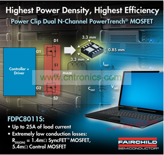 张瑞斌向记者介绍:“FDPC8011S专为更高的开关频率的应用而开发,在一个采用全Clip封装内集成1.4m? SyncFETTM 技术和一个5.4m?控制MOSFET、低质量因子的N沟道MOSFET,有助于减少同步降压应用中的电容数量并减小电感尺寸。该器件具有源极朝下和低侧MOSFET可以实现简单的布局和布线,提供更紧凑的线路板布局并获得最佳的散热性能。”FDPC8011S具有超过25A的输出电流,与其它普通3x3mm2 双MOSFET器件相比,输出电流容量提高了2倍。