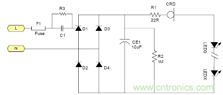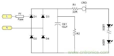 由于恒流二极管需要一定的电压Vk才能够进入恒流, 所以太低的电源电压是无法工作的。通常这个Vk大约在5-10V左右 所以大多数采用电池供电的LED是无法工作的, 最大电流由于恒流二极管的功耗受到限制, 所以过大的电流也是不合适的。例如1W的LED通常需要350mA, 恒流二极管就很难提供, 目前比较合适的使用场合就是交流市电供电的LED灯具采用很多小功率LED串联也就是高压小电流的情况是最为合适;但是由于恒流二极管的耐压有一定的限制 所以它所能吸收的电源电压变化也是有限的。就拿100V耐压的CRD来说用在220V市电电源里都还只能对付有限的电压变化。220V经过桥式整流以后它的输出直流电压大约为264V.如果市电变化+10% ~-15%就相当于整流后为290~187V, 电压变化103V.已经超过其耐压了。因为LED伏安特性的非线性 所以很难用公式来表示。总之当市电电压降低时LED中的电流就会随市电电压的降低而降低。其亮度也会跟着变。 典型应用电路中图3为典型的应用电路, 图4为加了阻容降压的应用电路为了应对低电压的输出场合。