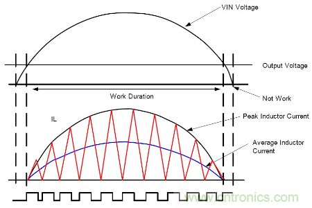 在半个输入电压周期内, 控制TON固定, 则电感电流峰值跟随输入电压峰值, 且相位相同, 实现高功率因素PF, 有如下等式: