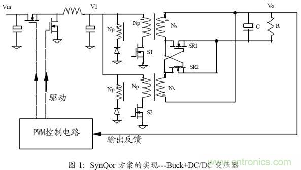 标准DC/DC 二次电源(半砖,1/4 砖)模块,采用了Buck 与DC/DC 变压器相级联的两级电路方案,如图(1)所示。初初一看,这个方案比单级方案(如有源箝位正激电路)的元器件数要多,不太合理。但通过分析,可以发现:其功率器件的总数并没有增加(因为在低压大电流输出的应用场合,输出同步整流MOSFET 即使在单级方案中也要多个并联才能实现效率指标);磁芯和电容元件的总面积也没有增加(因为可以用更小的磁芯和电容)。但由于两级方案容易优化和设计,故??榈牡缙阅艿玫搅思蟮母纳?,具体分析见下面的介绍。