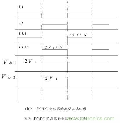 这个方案的第一级是一个同步整流Buck 变换器,它将不稳定的输入电压,调整到后级DC/DC 变压器所合适的输入电压,通过反馈输出和误差放大等,去控制Buck 变换器的PWM占空比,从而稳定输出。DC/DC 变压器的电路和工作波形如图2 所示: