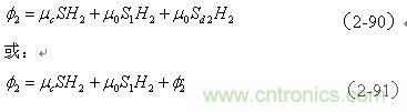 (2-91)式中,咋看起来,变压器初级线圈N1产生的磁通量 全部穿过变压器次级线圈N2,它们之间应该不存在漏磁通;但是,初级线圈在面积S1中产生的磁通 的方向与在面积Sd2中产生的磁通 的方向,正好互相相反;因此,变压器初级线圈N1在面积Sd2中产生的磁通 ,仍然称为变压器初级线圈N1对变压器次级线圈N2的漏磁通,其等效电感同样称为漏感。