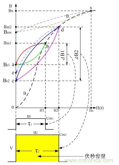 图9是开关变压器伏秒容量与磁场强度H、磁感应强度B的对应关系图。图中,脉冲幅度V总是与磁感应强度的增量