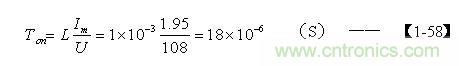 当占空比等于0.5时,对应的输入电压U为108V,对应的最大电流Im为1.95A,假设开关变压器初级线圈的电感量L=1000uH,根据【1-45】式,可求得Ton的值为: