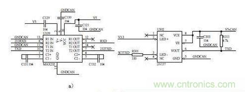 电池管理系统将采集处理后的数据通过串口发送到PC机界面上,实现人机交互。通过串口界面,可以观察到电池的总电压、单体电压、电流、SOC、故障状态、充放电功率等参数,还可以通过串口发送实现管理系统的在线标定。其硬件电路主要基于MAX232芯片,如图3a)所示。