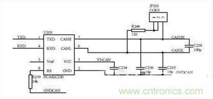 在电路中可根据整车要求,是否接入120Ω的终端电阻,当JP201跳线接1脚和2脚时,不接入电阻,当接2脚和3脚时,电阻接入。