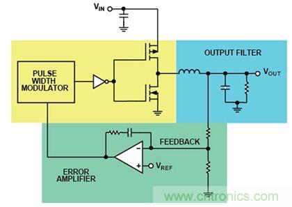 将典型开关电源输出电压(图1)与内部基准电压进行比较,可看到差别集中在脉宽调制器(PWM)。PWM将斜坡与放大器输出进行比较,生成PWM信号来控制开关,从而向负载供电。