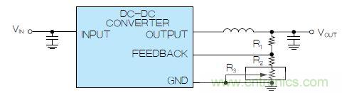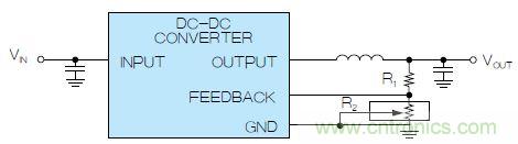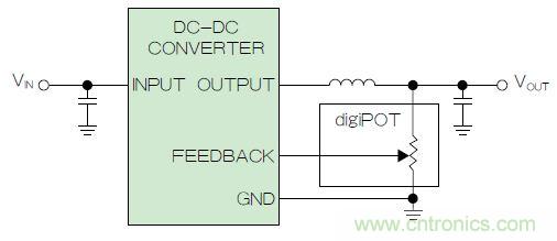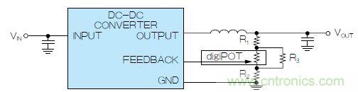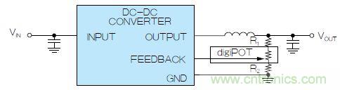 图2. 使用数字电位计调整DC-DC转换器输出电压,组成可变反馈电阻