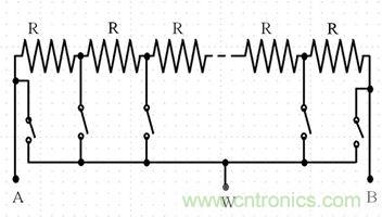图3:显示电子开关的64位数字电位计。同一时间只能闭合一个电子开关,该开关决定电阻比。