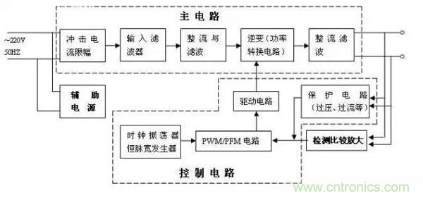 开关电源大至由主电路、控制电路、检测电路、辅助电源四大部份组成,见图1。
