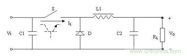 开关电源就是采用功率半导体器件作为开关元件,通过周期性通断开关,控制开关元件的占空比来调整输出电压。开关元件以一定的时间间隔重复地接通和断开,在开关无件接通时输入电源Vi通过开关S和滤波电路向负载RL提供能量,当开关S断开时,电路中的储能装置(L1、C2、二极管D组成的电路)向负载RL释放在开关接通时所储存的能量,使负载得到连续而稳定的能量。