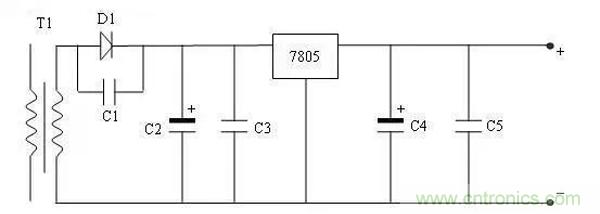 经检查,供光谱仪主板的直流5V电源仅剩2.3伏左右,脱开5V直流电源的负载,通电再次测量5V直流电源,这时则有5V,初步判断此5V直流电源带载能力差,拆开电源外壳进行检修,由于没有带负载时,通电有直流5V输出,故重点检查次级线圈侧的输出整流电路,给5伏电源接上假负载通电进行测量发现三通稳压7805的1、2脚之间电压为5.2伏,2、3脚之间却剩2.3伏,如图4,故判断三通稳压管7805性能变坏,更换三通稳压管7805故障解决。