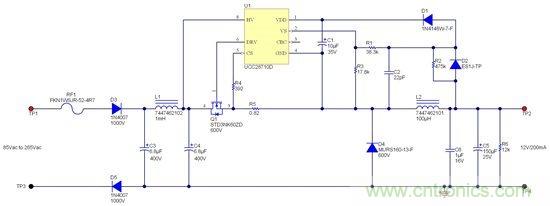 PMP9087 — 85VAC-265VAC 输入、12V/200mA 无变压器偏置电源