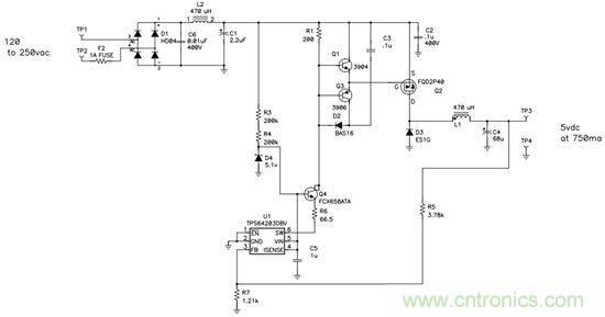 PMP5412 — 120VAC-250VAC 输入、5V/0.75A 无变压器偏置电源