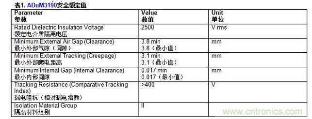 ADuM3190采用小型16引脚QSOP封装,隔离电压额定值为2.5 kV rms。 ADuM3190的安全额定值如表1所示。