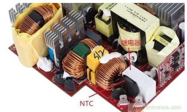 如图5,一些电源会安装负温度系数热敏电阻(NTCThermistor)和继电器。安装在这里的NTC的作用也是抑制电源接通瞬间的浪涌电流,保护电子设备。原理简而言之就是“阻值随温度升高而降低”。举个例子,假设上图电源的NTC在“零电流通过/零功率”状态下的阻值为20欧,当机器冷启动时,瞬态电流让NTC阻值急速下降至低于1欧,随着后续持续电流的输入,NTC持续发热,维持在低阻值,功耗极低。
