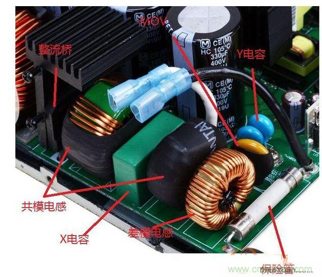 从图3可以看到X电容、Y电容、共模电感、差模电感、保险管、MOV。他们的分工如下:
