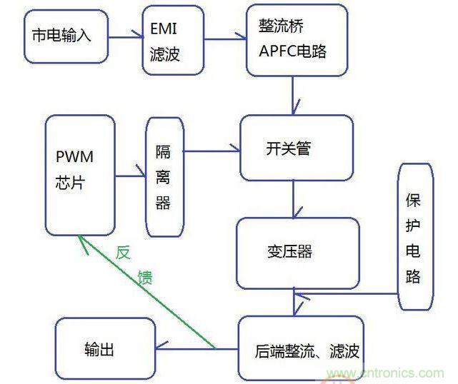 图1是一个典型的双管正激拓扑结构,肖特基整流、单路磁放大稳压,由CWT代工。1是EMI滤波电路。2主要是APFC(主动式功率因数校正),主要包括整流桥、主动PFC电感和升压电容、PWM芯片。3主要包括变压器和磁放大电感、待机驱动芯片。4是后端整流,二次侧(输出端)电路。两条散热片上,2和3间钉着开关管,3和4间钉着整流管。图上没框住的还有三颗光耦,没特意标出的有?;さ缏?、输出线材、背部元件、电路板等。大体示意图表示如图2: