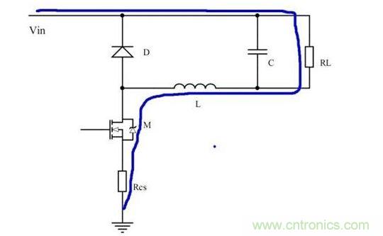 接下来的开关周期内,电感通过二极管D续流,如图3所示。这就出现了一个问题,此时的电流不再流经开关管,控制电路无法知道电流下降到何种程度了。