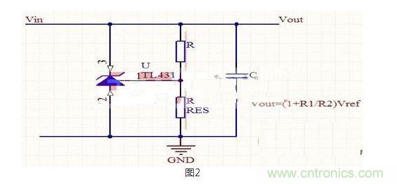 稳压电路的另一种形式,有些芯片对供电电压要求比较高,例如AD/DA芯片的基准电压等,这时常用的一些电压基准芯片如TL431、MC1403、REF02等。TL431是最常用基准源芯片,有良好的热稳定性能的三端可调分流基准电压源。它的输出电压用两个电阻就可以任意地设置到从Vref(2.5V)到36V范围内的任何值。最常用的电路应用如下图示,此时Vo=(1+R1/R2)Vref。选择不同的R1和R2的值可以得到从2.5V到36V范围内的任意电压输出,特别地当R1=R2时,Vo=5V。