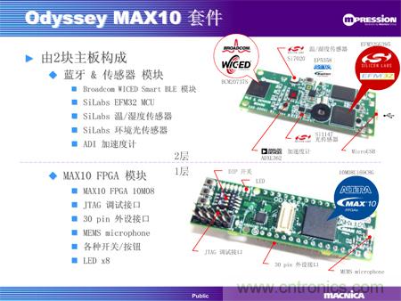 “Odyssey”开发套件是为物联网应用而设计的开发与评估套件,用户可在iOS和Andriod手机上安装专用应用程序,直接通过蓝牙接口读写分析数据以及远程控制。该开发套件由一块MAX 10 FPGA板卡和一块蓝牙及传感器板卡组成。