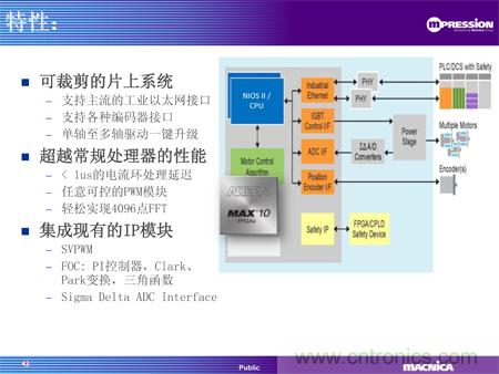 同期推出的还有骏龙科技基于MAX® 10 FPGA的电机驱动方案,通过FPGA实现马达控制的算法核心,提供了高性能、定制化和单芯片的解决方案,为马达控制带来革命性的质的飞跃。使用FPGA 替代传统的CPU/DSP架构实现算法,意味着所有的算法都将通过硬件实现,这样由于处理能力限制而在CPU中无法实现的算法,现在都可以在MAX® 10 FPGA中以轻松地实现。Altera的MAX 10支持EtherCAT、Powerlink、Mechatrolink等工业以太网接口以及Endat 2.2, BISS等编码器接口,用户可以该方案中实现灵活可定制的接口。该方案还提供可定制的调试界面,客户可以根据自己的需求,定制自己的调试界面,实时观测内部信号。