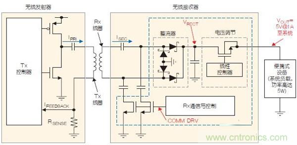 典型的无线电源系统(图2)在便携式设备内有一个接收器(Rx),它提供能量给电池充电。发射器(Tx)位于一个固定的底座内,并连接至壁挂式电源。输入电能转换为交流电,然后在发射器线圈与接收器线圈非常接近时,通过线圈发生磁耦合。接收器的输出在电流高达1A时通常为5V,其可为便携式设备内的电池充电器IC提供输入功率。