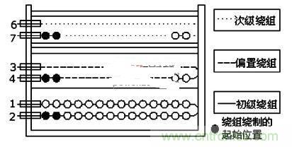 图3:变压的初级、次级和偏置绕组的绕制示意图