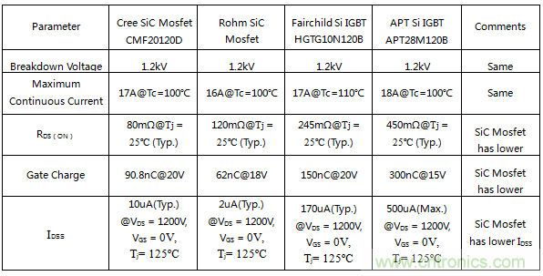 目前市面上常见的SiC Mosfet电流均不大于50A,以常见的1200V/20A为例,列举了Cree公司与Rohm公司的SiC Mosfet管的部分电气参数;同样例举了Fairchild 与APT公司的1200V/20A Si IGBT系列的电气参数进行比较;