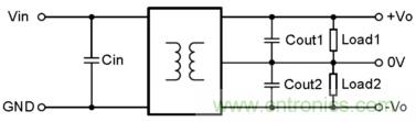 该电源产品:18~36V输入,+5V/600mA(稳压),-5V/600mA(非稳压),双路总功率为6W,±5V共地。每路最小负载建议>10%Io使用,正负双路在平衡负载使用,-5V输出电压偏差会比较小。