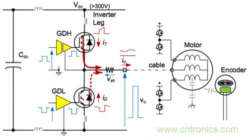 三相逆变器是一种功率电子开关电路,控制功率从直流供电轨到三个交流电机绕组的流动。逆变器有三条相同的腿,每条腿包括两个IGBT晶体管和两个二极管,如图1所示。每个电机绕组均连接至通过分流器连接高端晶体管和低端晶体管的同一节点。逆变器使电机绕组在直流总线的高压轨和低压轨之间切换,以控制平均电压。绕组具有极高的电感性,将阻挡电流的变化,因此,当功率晶体管关闭时,电流将开始在连接至相反电源轨的二极管中流动。这样,即使逆变器功率设备和直流链路电容中存在断续传导,也会有电流连续流到电机绕组中。电机绕组阻抗充当来自逆变器的高压脉冲宽度调制方波输出电压的低通滤波器。将低压控制电流连接至逆变器时存在巨大的困难。一个基本问题是,高端晶体管发射器节点在高压总线高供电轨与低供电轨之间切换。首先,高端驱动器必须能够驱动相对于一个发射器(可能比共用输入信号高300 V或以上)的栅极信号。其次,通过分流器(vsh)的电机电流信号必须从300 V或以上的共模电压中提取出来。其他问题将由电源电路中的寄生元件导致。当功率晶体管或二极管的开关频率超过1 A/ns时,即使是10 nH的PCB走线电感也可能导致显著的电压(>10 V)。寄生电感和部件电感会导致振铃,结果使设备开关产生的噪声脉冲的持续时间变长。甚至电机电缆的高频阻抗也可能带来问题,因为出于安全考虑,配电板可能离电机很远。其他效应包括噪声从电机耦合到反馈传感器信号中,其原因是快速切换的绕组电压波形。问题将变得更加严重,因为驱动电路的功率额定值将增加电路板的物理尺寸,结果将进一步增加寄生电感,甚至提高电流和电压开关速率。
