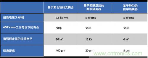 安全标准通常规定1分钟耐压额定值(典型值2.5 kV rms至5 kV rms)和工作电压(典型值125 V rms至400 V rms)。某些标准也会规定更短的持续时间、电压浪涌(如10 kV峰值并持续50 µs)作为增强绝缘认证的一部分要求。聚合物/聚酰亚胺隔离器可提供最好的隔离特性(见表1)。聚酰亚胺数字隔离器与光耦合器类似,在典型工作电压下,工作寿命超过电机,额定使用寿命为50年。SiO2隔离器的工作寿命与之接近,但是,对高能浪涌的?;つ芰θ唇先?。