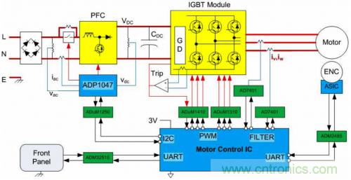 展示了栅极驱动、通信和反馈信号隔离的典型驱动电路如图4所示。在该系统中,隔离的Σ-Δ ADC用来测量电机绕组电流,数字位流则由电机控制IC上的数字过滤电路进行处理。位置编码器包含一个ASIC,由其通过一个隔离式RS-485接口将位置和速度数据发送给电机控制IC。其他隔离式串行接口包括连接PFC的I2C接口以及连接前面板的隔离式RS-232链路。在此例中,PWM信号与逆变器??楦衾?,IGBT由一个嵌入该??橹械牡缙阶徽ぜ髑?/div>