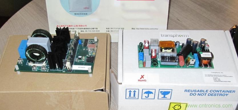 在演讲现场,富士通电子展示了两款基于HEMT器件的电源??榉桨?。“我们的PFC+LLC电源与类似的竞争方案相比,电路板尺寸可以缩减45%,在满载和10%的负载下,我们可以分别提高1.7%和3%的效率。对于很多效率要求苛刻的应用来说,这是一个非常大的提升。”Eric指出。