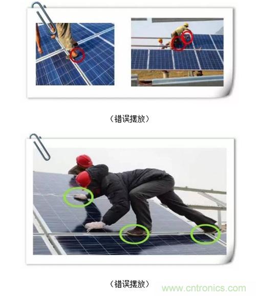 2、组件安装过程中,应尽量避免安装工人在组件上直接落脚进行操作,若必须上人,工人落脚点及手扶着力点只能是组件边框上。