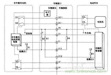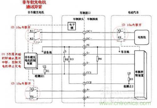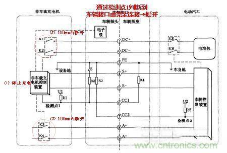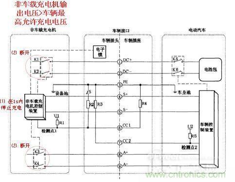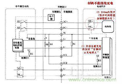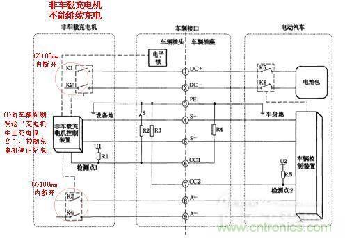 2)在充电过程中,非车载充电机控制装置通过对检测点1的电压进行检测,如果判断车辆接口由完全连接变为断开(如车辆意外移动、充电枪线缆被意外扰动等),则控制非车载充电机停止充电,应在100ms内断开K1、K2、K3、K4。