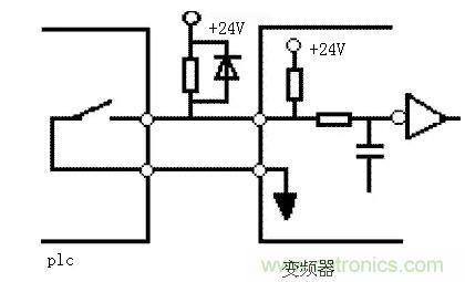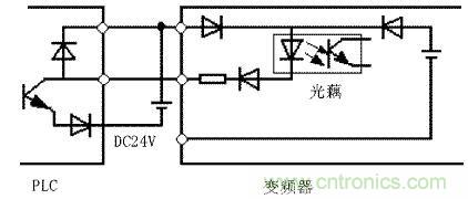 当输入开关信号进入变频器时,有时会发生外部电源和变频器控制电源(DC24V)之间的串扰。正确的连接是利用PLC电源,将外部晶体管的集电极经过二极管接到PLC。如图4所示。