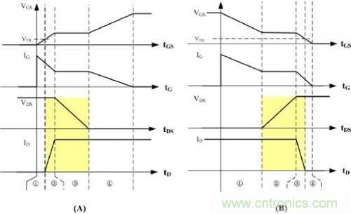 开关导通时对应的波形图如图2(A),开关截止时对应的波形图如图2(B),可以看到开关管每次导通、截止时开关管VDS电压和流过开关管的电流ID存在交叠的时间(图中黄色阴影位置),从而造成损耗P1,那么在开关频率fs工作状态下总损耗PS= P1 *fs,即开关频率提高时,开关导通与截止的次数越多,损耗也越大。