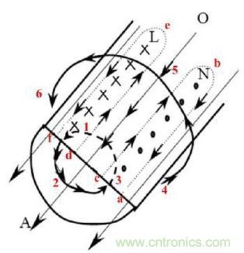 变压器的铁损主要由变压器涡流损耗产生,如图3所示,给线圈加载高频电流时,在导体内和导体外产生了变化的磁场垂直于电流方向(图中1→2→3和4→5→6)。根据电磁感应定律,变化的磁场会在导体内部产生感应电动势,此电动势在导体内整个长度方向(L面和N面)产生涡流(a→b→c→a和d→e→f→d),则主电流和涡流在导体表面加强,电流趋于表面,那么,导线的有效交流截面积减少,导致导体交流电阻(涡流损耗系数)增大,损耗加大。