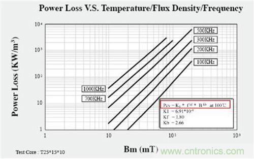 如图4所示,变压器铁损是和开关频率的kf次方成正比,又与磁性温度的限制有关,所以随着开关频率的提高,高频电流在线圈中流通产生严重的高频效应,从而降低了变压器的转换效率,导致变压器温升高,从而限制开关频率提高。