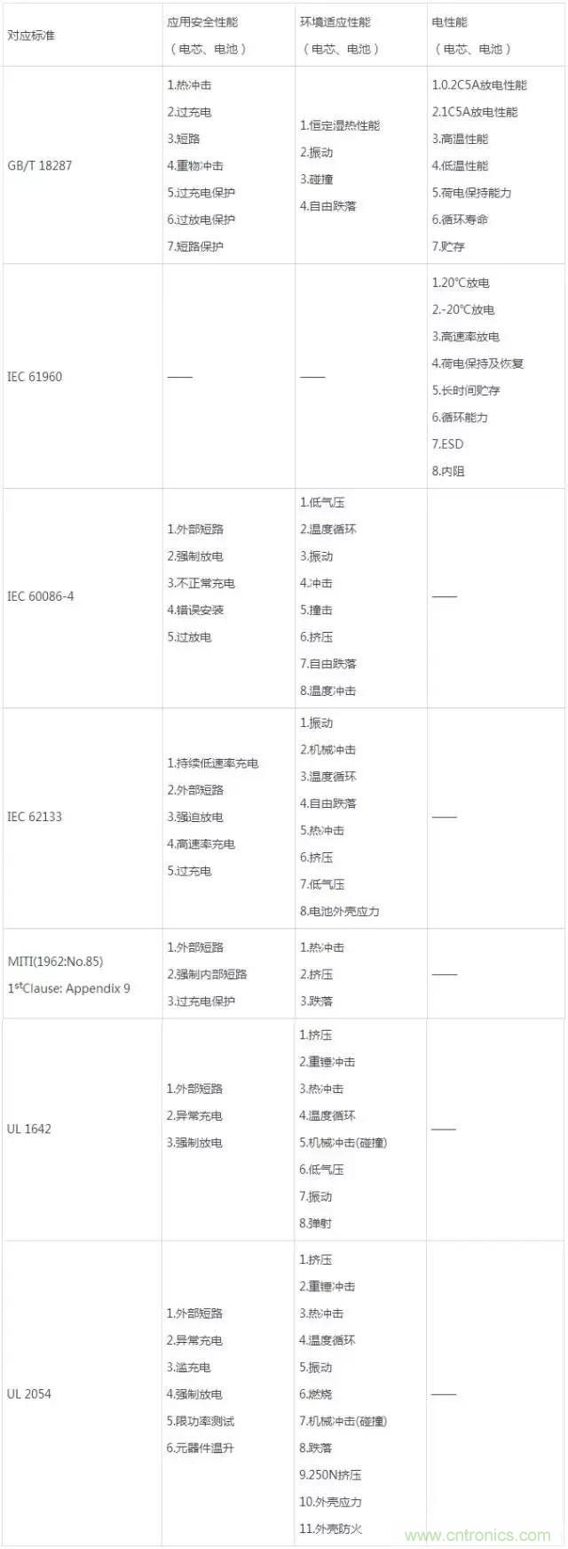 今天编辑将这些主要锂电池标准分别从不同的角度考察了锂电池的安全性和电性能,现将分类如下。从表上可以看出,目前锂电池各种标准主要从三个角度考察锂电池的安全及电性能: