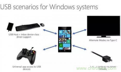 微软Windows 10引入对Type-C的支持,不仅桌面版Windows 10原生支持USB Type-C接口,手机版Windows 10也支持,可以轻松实现搭载Windows 10操作系统的手机与USB主设备或者是USB配件两者之间进行数据交换以及视频共享。例如:手机与USB外围设备交互数据,支持XboxOne??仄鳌⑹蟊?、键盘、插座以及使用USB Type-C接口外接显示器或电视等,Type –C或将开创连接新模式。