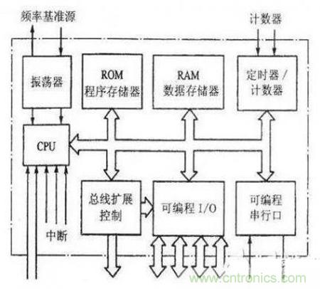 Ⅰ:中央处理器CPU,包括运算器、控制器和寄存器组。是MCU内部的核心部件,由运算部件和控制部件两大部分组成。前者能完成数据的算术逻辑运算、位变量处理和数据传送操作,后者是按一定时序协调工作,是分析和执行指令的部件。