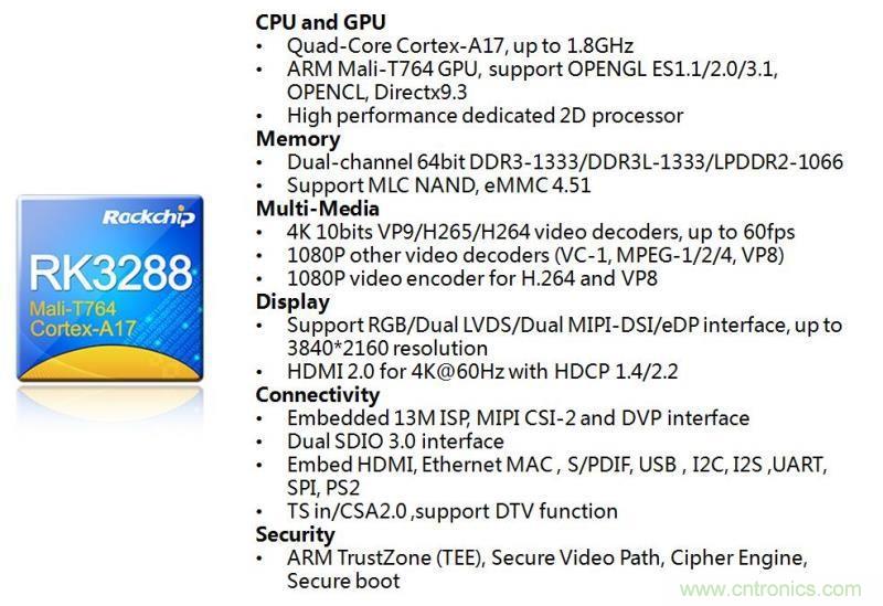 性能方面,RK3288基于28nm HKMG工艺,处理器采用了四核ARM Cortex-A17,主频达到了1.8GHz。DDR控制器采用双通道64bits DDR3/DDR3L/LPDDR2设计。GPU采用四核Mali-T7系列GPU,频率高达600MHz。该芯片内置了2D/3D图形GPU加速处理器,完美支持OpenGL ES 1.1/2.0/3.1、OpenCL 1.1、DirectX9.3,在3D效果方面相较同类产品有较大的提升。RK3288还支持全部主流视频格式解码,支持H.265和4Kx2K分辨率视频解码。